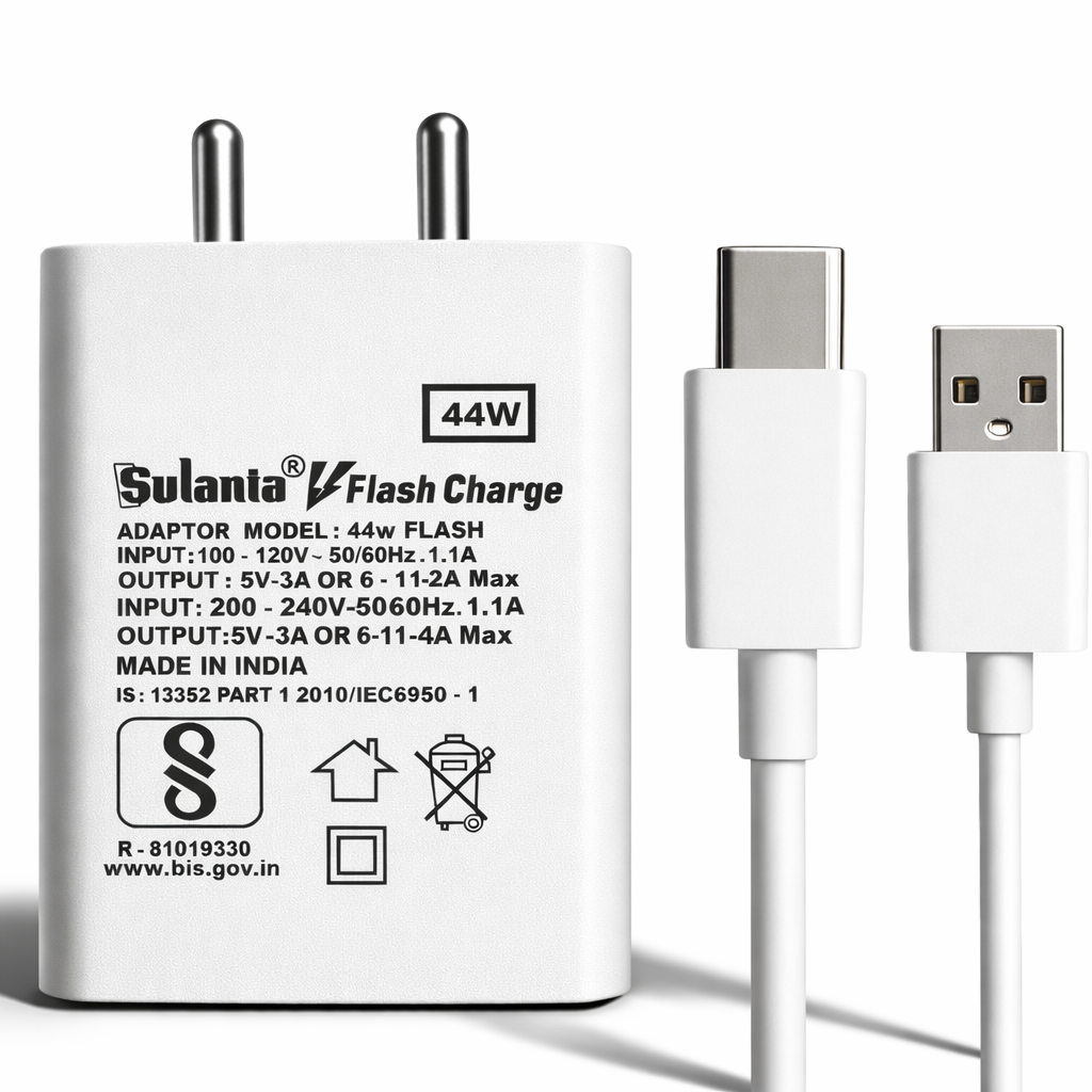 Sulania Orignal BIS Certtified 44W Flash Charger With USB Type A to Type C DatacableSulania Orignal BIS Certtified 44W Flash Charger With USB Type A to Type C Datacable
